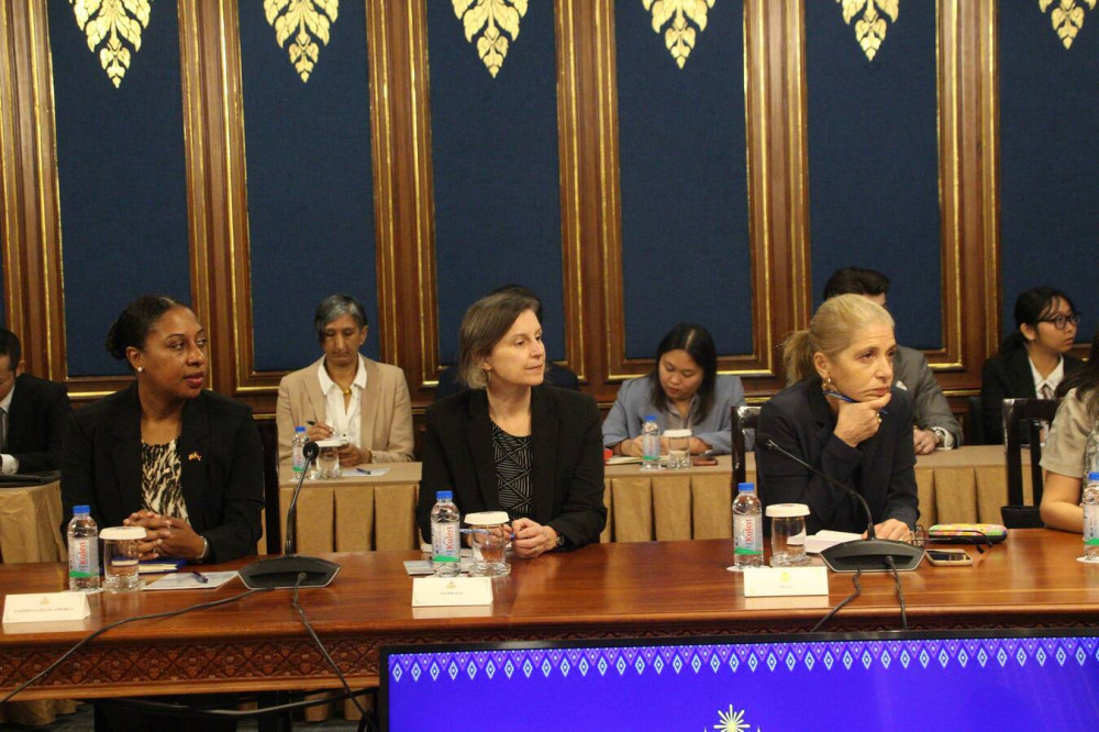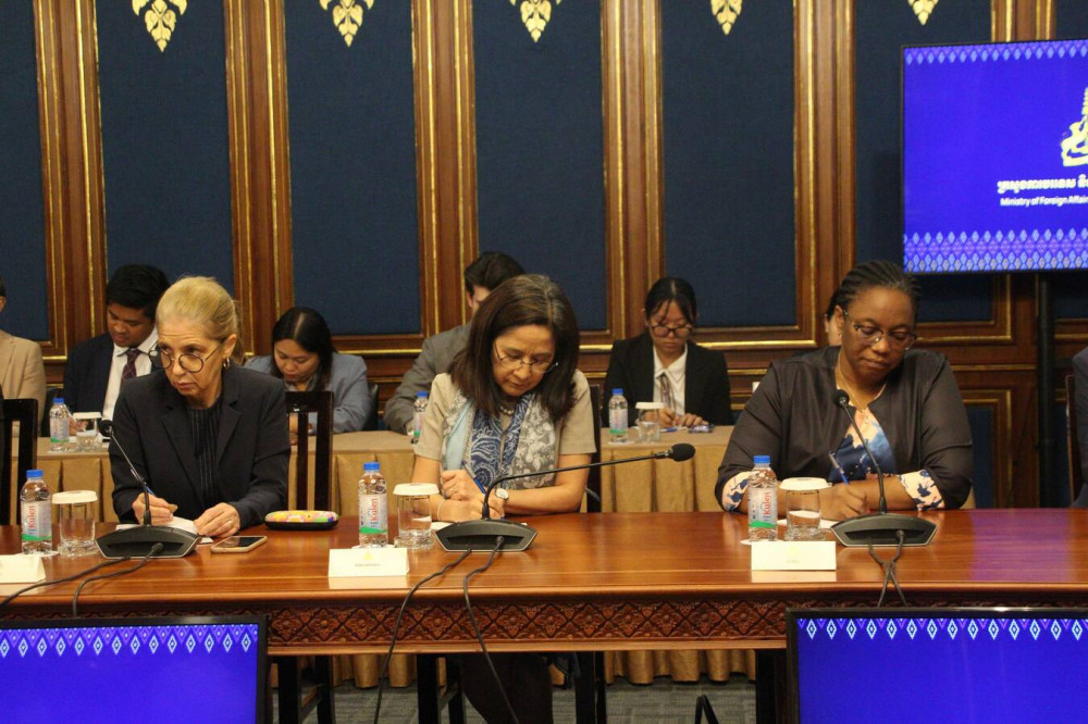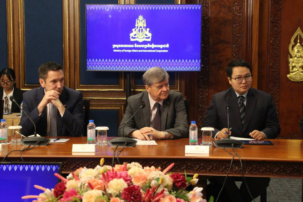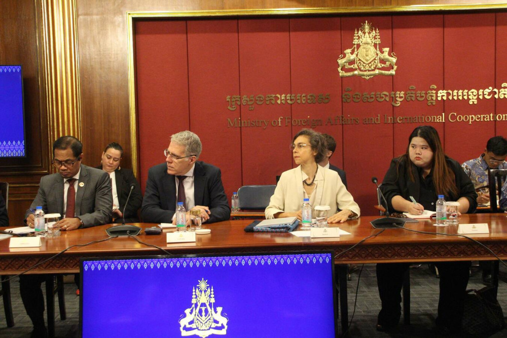2月18日上午,柬埔寨外交与国际合作部代理部长Eat Sophea,以及国务部长兼打击网络诈骗委员会秘书长Chhay Sinarith,在金边外交与国际合作部共同主持召开专题通报会,向各国驻柬使节介绍柬埔寨政府近期开展打击网络犯罪行动的有关情况。