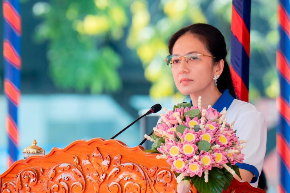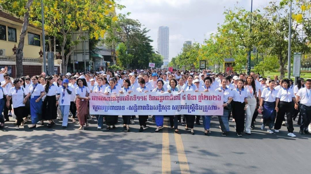 柬新社金边2026年3月12日 -- 柬埔寨第一夫人碧占莫妮出席“为我们所有人持久和平”步行活动,并发表致辞。她强调,和平不仅仅意味着战争的结束,更关乎妇女和儿童日常生活中的安全感与希望。