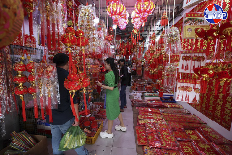 走访金边市部分市场可以看到,各类春节装饰品和年货陆续上架销售。在乌亚西市场,年货摊位绵延数十米,放眼望去尽是中国红。红龙灯蜿蜒悬挂,春联金字熠熠生辉,各式红包、福字贴琳琅满目。吸引不少华裔家庭前来选购。商贩表示,随着春节临近,相关商品销量明显增加,节日气氛也日渐浓厚。